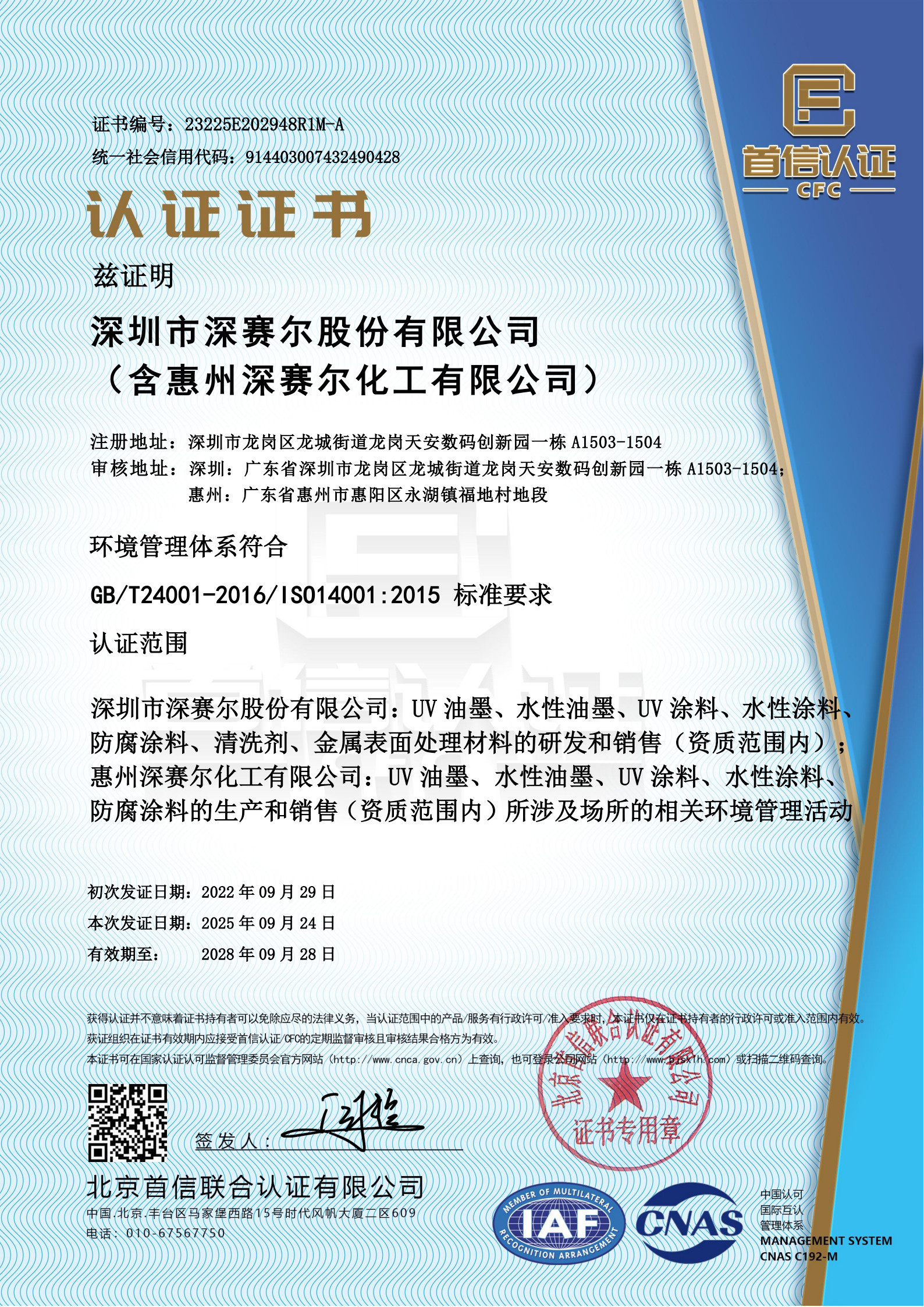 ISO 14001环境管理体系认证证书