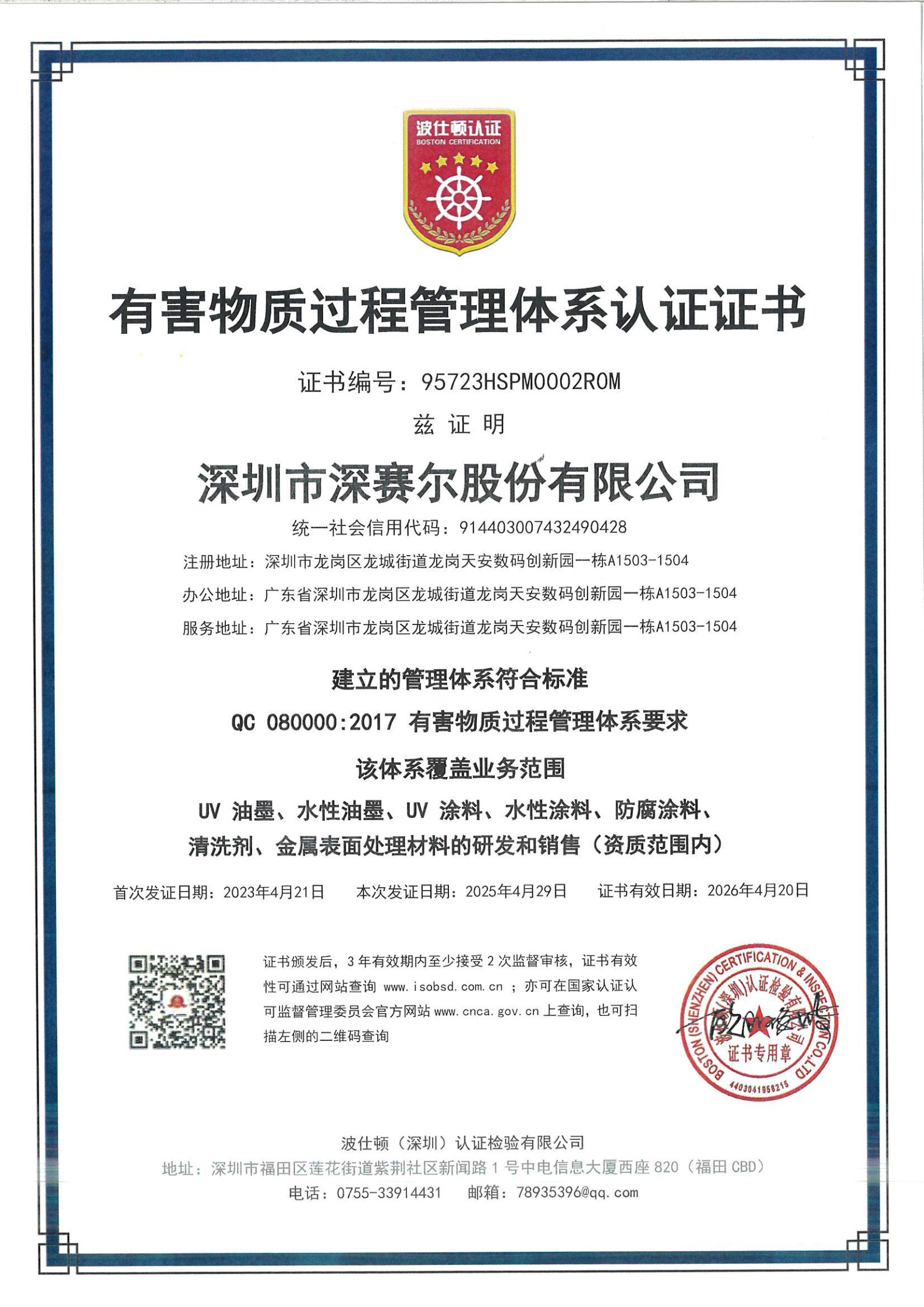 有害物质过程管理体系认证证书
